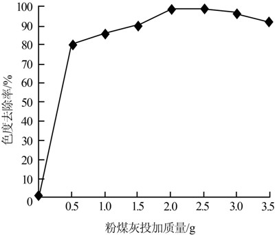 取500 mL容量燒杯8只,各加入400 mL的模擬染料廢水,分別加入粉煤灰0、0.5、1.0、1.5、2.0、2.5、3.0、3.5 g并調節(jié)廢水的pH至2。將燒杯放到攪拌器上按2.1中的攪拌過程攪拌后靜置10 min,最后測定廢水的吸光度,計算色度去除率,選出效果最佳的粉煤灰的投加量。實驗結果見圖 2。
