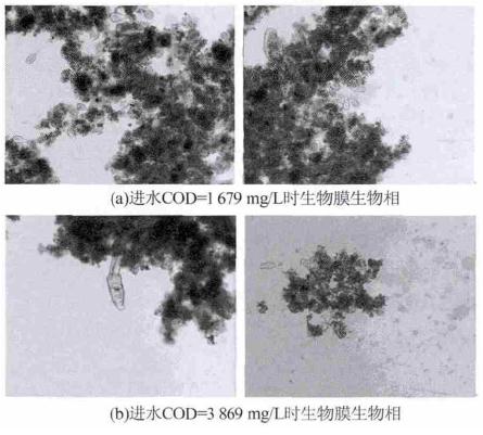 由圖 3 可知,當(dāng)進水COD 負(fù)荷為1 679 mg/L 時,生物膜中的生物相豐富,出現(xiàn)大量片狀菌膠團、鐘蟲、累枝蟲、微盤蓋蟲、游仆蟲等固著性纖毛蟲,形成較好的微生物膜,其優(yōu)勢種群主要是固著型的纖毛蟲(鐘蟲、累枝蟲)。當(dāng)進水COD 負(fù)荷為3 869 mg/L 時,生物膜中的生物相減少,菌膠團分散、數(shù)量少,生物膜活性降低,因此處理污水效果降低。