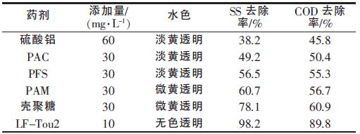 取生活廢水水樣于燒杯中,分別投入硫酸鋁溶液、聚合氯化鋁溶液(PAC)、聚合硫酸鐵溶液(PFS)、聚丙烯酰胺溶液(PAM)、殼聚糖、絮凝劑LF-Tou2,攪拌反應(yīng)并沉降,測(cè)定絮凝后上清液的SS 和COD。絮凝效果如表 1 所示。由表 1 可見,絮凝劑LF-Tou2的絮凝效果明顯高于其他5 種絮凝劑,其COD 去除率達(dá)到89.8%,SS 去除率為98.2%。