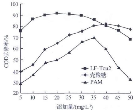 (2)考察了絮凝劑LF-Tou2 的最佳絮凝條件:pH 為7.5、添加量為19 mg/L、溫度為27 ℃、攪拌時(shí)間為3 min,其COD 去除率達(dá)到92.9%。