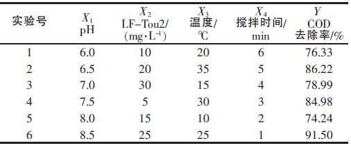 采用均勻設(shè)計(jì)表中的4 因素6 水平實(shí)驗(yàn)6 組方案,確定絮凝劑LF-Tou2 的最佳絮凝效果。實(shí)驗(yàn)設(shè)計(jì)方案和結(jié)果如表 2 所示。