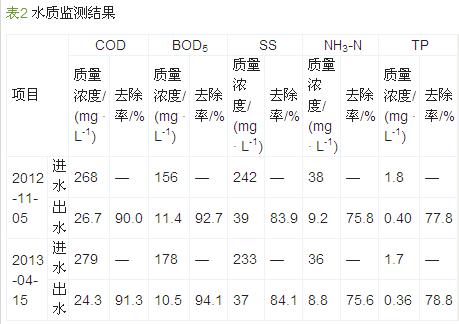 調(diào)試運(yùn)行一個(gè)月后開(kāi)始對(duì)生活污水進(jìn)水及清水池出水進(jìn)行監(jiān)測(cè),水質(zhì)監(jiān)測(cè)結(jié)果如表 2所示。