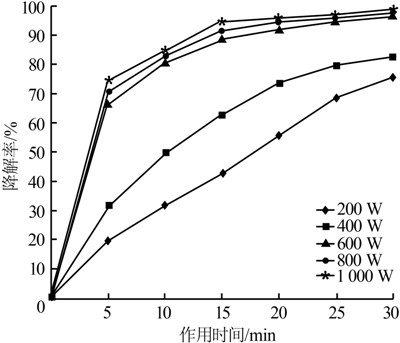 由圖 4可以看出,HPAM降解率隨微波功率的增加而不斷提高,在相同輻照功率下,起始階段反應速率較大,延長微波的輻照時間,HPAM降解率提高不明顯。分析原因認為,在反應初始階段,HPAM和臭氧濃度較大,反應速率較快,但隨著反應的持續(xù)進行,HPAM和臭氧的濃度不斷降低,反應速率也隨之降低。