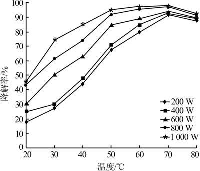 聚合物溶液HPAM初始質量濃度250 mg/L,在微波頻率為2 450 MHz,臭氧流量100 mg/(L·h),反應30 min條件下,考察溶液溫度對HPAM降解率的影響,結果見圖 5。