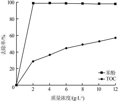 在100 mL質(zhì)量濃度為500 mg/L的苯酚溶液中加入450 mmol/L H2O2,分別加入2、4、 6、8、10、12 g/L載鐵竹炭催化劑,在室溫下150 r/min振蕩2 h,測定反應(yīng)后溶液中的苯酚和TOC含量,考察催化劑的投加量對廢水處理效果的影響,結(jié)果見圖 1。