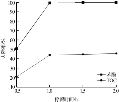 由圖 4可以看出,停留時間為0.5 h時,由于停留時間較短,反應(yīng)不夠完全,大分子物質(zhì)部分被分解,因此苯酚和TOC去除率都比較低。隨著停留時間的延長,反應(yīng)繼續(xù)進行,物質(zhì)被進一步分解,苯酚和TOC去除率大幅度提高。反應(yīng)完全后,繼續(xù)延長停留時間對廢水處理效果影響不大,苯酚和TOC去除率基本保持不變,綜合考慮,確定停留時間為1.0 h。