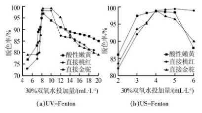 由圖 1可見,隨著雙氧水投加量的增加,偶氮染料脫色率在兩種高級氧化法處理時均呈現(xiàn)先增加后降低的趨勢,當采用UV-Fenton法時,雙氧水的投加量在8.0~10.0 mL/L時會使3種不同結(jié)構(gòu)的偶氮染料的脫色率均維持在95%以上。當采用US-Fenton法時,雙氧水的投加量在3.5~5.0 mL/L時會使3種不同結(jié)構(gòu)的偶氮染料的脫色率均維持在95%以上。有研究指出〔7, 8〕,雙氧水在高級氧化法中承擔的作用是向反應(yīng)體系中提供羥基自由基,本研究也發(fā)現(xiàn),羥基自由基的提供以及增加對偶氮染料的脫色起到了關(guān)鍵性的主導(dǎo)作用,在研究的范圍內(nèi)(雙氧水投加量在2~20 mL/L),雙氧水的存在使得偶氮染料的脫色率均維持在70%以上。本研究同時發(fā)現(xiàn),由于UV-Fenton系統(tǒng)可向反應(yīng)體系提供的能量(30 W)低于US-Fenton系統(tǒng)(50 W),加之UV-Fenton系統(tǒng)的反應(yīng)溫度(室溫)低于US-Fenton系統(tǒng)(55 ℃),因此UV-Fenton系統(tǒng)較US-Fenton系統(tǒng)所需提供的雙氧水量更高。