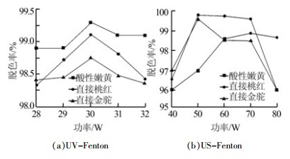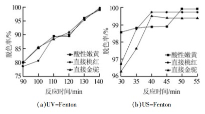 UV-Fenton與US-Fenton均可產(chǎn)生大量活性粒子,氧化水體中難降解有機污染物,對于典型印染廢水——偶氮染料均可取得95%以上的脫色率;綜合理論試劑投加費用、耗電量以及反應(yīng)時間等因素,US-Fenton擁有更好的應(yīng)用前景。