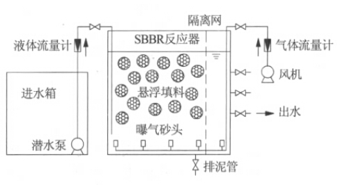 (1)在傳統(tǒng)SBR 反應(yīng)器中投加填料,在其表面形成生物膜以使世代時(shí)間較長(zhǎng)的硝酸菌得以固著繁殖,提高系統(tǒng)的生物量。