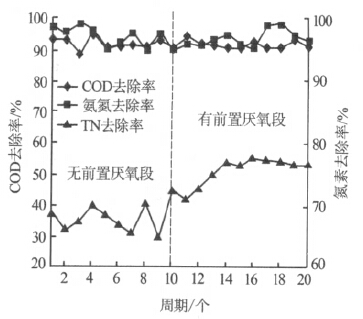 圖 3 設(shè)置厭氧段對(duì)COD、氨氮、TN 去除效果的影響