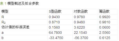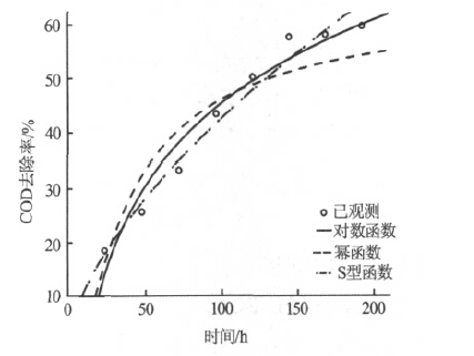由圖 4 可見,經(jīng)過6 d 的處理,包埋復合菌可以去除60%左右的COD,繼續(xù)增加處理時間,COD 去 除率的變化不明顯。而且,COD 去除率的變化曲線形狀與S 型函數(shù)、對數(shù)函數(shù)以及冪函數(shù)的圖形較相似,所以,以這3 種函數(shù)來擬合COD 去除率隨時間的變化曲線,初步模擬COD 去除的動力學過程。 3 種模型對圖 4 中數(shù)據(jù)擬合的結果如圖 5、表 1 所示。