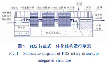 從圖1 可以看出,PDS 轉(zhuǎn)鼓式一體化裝置的核心是旋轉(zhuǎn)生物處理單元,初沉池沉降大部分懸浮物及無機(jī)顆粒物之后,處理水進(jìn)入缺氧池進(jìn)行反硝化,實(shí)現(xiàn)生物脫氮,之后進(jìn)入生物轉(zhuǎn)鼓高效降解污染物,伴隨著反應(yīng)的進(jìn)行,老化的生物膜在二沉池里得以沉降去除。