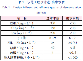 本示范工程規(guī)模為50 m3/d,占地面積為300m2,工程納污戶數(shù)150 戶,總?cè)藬?shù)為450 人,污水主要來源是居民廚房污水、浴室洗澡污水及其他公共場(chǎng)所的沖廁污水等。