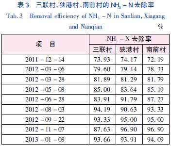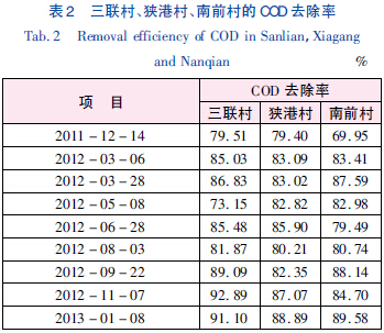 通過實(shí)驗(yàn)方法分別測(cè)得三聯(lián)村、狹港村和南前村的進(jìn)、出水COD 值,并計(jì)算得出各村的COD 去除率,如表2 所示。