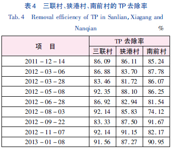 進(jìn)水TP 一般為1.5 ~ 3 mg/L,符合農(nóng)村生活污水的水質(zhì)特性; 經(jīng)組合工藝處理出水TP 平均濃度為0.28 mg/L,且全部低于0.5 mg/L,達(dá)到一級(jí)A 排放標(biāo)準(zhǔn),可見PDS 轉(zhuǎn)鼓式一體化裝置+ 人工濕地的組合工藝具有良好的除磷效果。三聯(lián)村、狹港村及南前村的TP 去除率見表4,最高去除率可達(dá)到92.35%,平均去除率高達(dá)86%,全年TP 去除率一直保持很高水平,證明該組合工藝適合蘇南農(nóng)村生活污水處理。