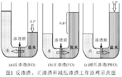 Lee 等(1981)[1]較早地概況總結了反滲透(RO)、正滲透(FO)和減壓滲透((Pressure Retarded Osmosis,PRO)過程的工作原理,如圖1 所示。在RO 過程中,水在外加壓力作用下從低化學勢側通過滲透膜擴散至高化學勢側溶液中( Δπ<ΔP),達到脫鹽目的。正滲透過程剛好相反,水在滲透壓作用下從化學勢高的一側自發(fā)擴散到化學勢低的一側溶液。而減壓滲透可認為是反滲透和正滲透的中間過程,水壓作用于滲透壓梯度的反方向,水的凈通量仍然是向濃縮液方向。這三個過程可以用下式來描述:Jw=A(σΔπ-ΔP);式中Jw—水通量;A—膜的水滲透性常數(shù);σ—反擴散系數(shù);Δπ—膜兩側的滲透壓差;ΔP—膜兩側的壓力差。