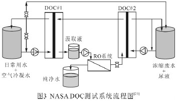 空間站和星際旅行都需要對水進行處理和循環(huán)利用。太空任務中可回收的水源有日常用水,尿液和空氣水分。美國宇航局(NASA)聯(lián)合Osmotek 公司開發(fā)了直接滲透濃縮系統(tǒng),即DOC 系統(tǒng)用于太空任務中的水處理和循環(huán)利用[22-23]。最初的DOC 測試系統(tǒng)處理流程如圖3 所示,包括一個反滲透處理系統(tǒng)和2 個DOC 預處理子系統(tǒng),一個是正滲透過程、另一個是正滲透與膜蒸餾結合過程(用于分離尿素和尿酸類物質(zhì)),采用氯化鈉驅動溶液將廢水濃縮后,利用反滲透從稀釋的汲取液中分離得到純凈水。