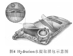 Hydration 水提取膜包是目前僅有的幾個正滲透技術商業(yè)化應用之一。當飲用水缺乏時用于從臟水中獲得飲用水。其結構如圖4 所示,由正滲透膜做成一個密封的包,里面放有可食用的汲取溶液(糖類和飲料粉未)[25]。當把這種膜包浸入臟水中時,水在滲透壓作用下擴散進入膜包,稀釋的汲取溶液就是可飲用的水溶液。由于這一過程不需要外加能源,得到的水沒有生物和外在有機物的污染,特別適用于野外救生和軍事應用。