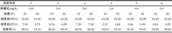 為找出處理印染污水的最佳用量,分別投加不同濃度的絮凝劑和不同溫度進行處理,以去濁率進行比較,實驗數(shù)據(jù)見表2。