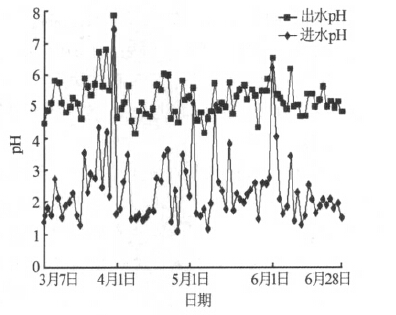 石灰石固定濾床的實(shí)際運(yùn)行效果主要以該處理單元的進(jìn)出水pH 作為考察對象,同時(shí)對濾池內(nèi)石灰石的消耗量進(jìn)行觀察。自2011 年3 月7 日起至6 月28 日近4 個(gè)月石灰石固定濾床的進(jìn)出水pH 變化如圖 3 所示。