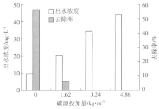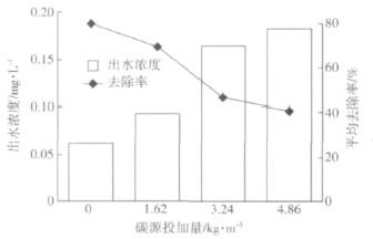從圖3 可以看出,碳源投加量為0 時,NH4+-N平均去除率為79.09%,出水NH4+-N平均濃度為0.47mg·L-1,小于0.5 mg·L-1,達《地表水環(huán)境質(zhì)量標(biāo)準(zhǔn)》(GB 3838—2002)Ⅱ類水質(zhì)標(biāo)準(zhǔn)。隨著碳源投加量的增加,出水NH4+-N平均濃度逐漸增大(1.19~1.76 mg·L-1),NH+4-N 平均去除率逐漸降低(46.73%~20.72%)。