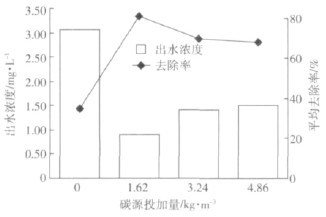 廢水中的TN 主要包括硝氮、氨氮及有機氮。大量研究表明,人工濕地中的氮主要通過系統(tǒng)內(nèi)微生物的硝化、反硝化作用去除。通過使用垂直流人工濕地及植物根系輸氧等方式,可以強化濕地內(nèi)微生物的硝化作用,因而微生物的反硝化作用成為濕地脫氮的決定性因素。微生物反硝化作用需要有機碳作為電子供體,以還原硝酸鹽氮,當(dāng)系統(tǒng)有機碳供應(yīng)不足時,會降低TN 的去除效率。雖然進水中提供一部分有機碳,但因其含量較低,不能滿足微生物反硝化作用脫氮所需要的有機碳含量,所以需要人工補充碳源。目前,人工濕地采用的補充碳源多為植物碳源,其脫氮效率較高[21-22]。濕地在運行過程中,甘蔗葉不斷分解釋放出有機碳,彌補了進水中有機碳的不足,強化了反硝化作用,提高了脫氮效率。從圖4 可以看出,碳源投加量為1.62 kg·m-3 較適宜。