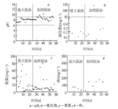 (2)加工加西原油產(chǎn)生污水pH 較大、硫化物含量低、氨氮含量低、含油量低、COD 高。具體參見(jiàn)http://wlmqsb.com更多相關(guān)技術(shù)文檔。