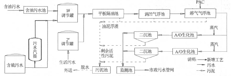 為了確保污水處理場(chǎng)外排水達(dá)標(biāo)排放,在現(xiàn)有污水處理場(chǎng)設(shè)施的前提下,采取了一系列措施:(1)含硫污水經(jīng)污水汽提處理。為避免污水處理場(chǎng)進(jìn)水水質(zhì)硫化物含量超標(biāo),含硫污水先經(jīng)過(guò)污水汽提裝置,將其中的硫化物部分轉(zhuǎn)化為H2S,減小混合后污水的硫化物含量。
