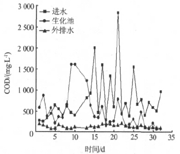 生化池馴化過(guò)程中,監(jiān)測(cè)到的COD 變化情況如 圖 4 所示。