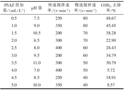 因此,去除廢水CODCr的最優(yōu)條件為: PSAZ投加量為0.5 mL/L、pH 值為8.75、快速攪拌速率為285 r/min、慢速攪拌速率為60 r/min。在此條件下進(jìn)行了驗(yàn)證試驗(yàn),結(jié)果CODCr去除率可達(dá)到60%,濁度去除率達(dá)到93%。