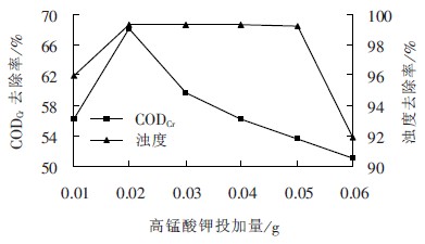 使用高錳酸鉀作氧化劑,投加量分別為0.01、0.02、0.03、0.04、0.05、0.06 g。以濁度和CODCr的去除率確定高錳酸鉀最佳投加量,結(jié)果見圖6。