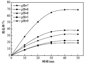 在三氯化鐵投加量為200 mg/L,皂土投加量為1 g/L,反應(yīng)溫度為20 ℃,活性藏青廢水初始濃度為10 mg/L 的條件下進(jìn)行實(shí)驗(yàn),考察混凝攪拌時(shí)間和pH 對(duì)混凝處理過程的影響,結(jié)果如圖4 所示。從圖4 可以看出,不同的pH 對(duì)混凝法去除水樣的色度很有效果。隨著攪拌時(shí)間和pH 的增加,出水的吸光度逐漸減小,色度去除率逐漸增大。當(dāng)攪拌時(shí)間為30 min,pH 為7 時(shí),出水吸光度顯示最小值0.026,色度去除率為64.8 %。繼續(xù)增加攪拌時(shí)間和增大pH,出水的處理效果并沒有隨之提高,而色度去除率也沒有不斷提高。這可能是因?yàn)楫?dāng)攪拌時(shí)間適宜、有機(jī)物濃度較高的時(shí)候,攪拌時(shí)間的增加有利于分子間的碰撞,它們反應(yīng)劇烈,所以廢水的處理效果明顯提高[6]。當(dāng)攪拌時(shí)間過長(zhǎng)時(shí),反應(yīng)已達(dá)飽和,色度去除率無(wú)太大變化。本實(shí)驗(yàn)表明,混凝的最適pH 為7,攪拌時(shí)間適宜用30 min 左右。