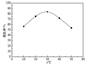 在三氯化鐵投加量為200 mg/L,皂土投加量為1 g/L,pH 為7,活性藏青廢水初始濃度為10 mg/L 的條件下,考察混凝溫度對(duì)處理廢水過程的影響,結(jié)果如圖6 所示。由圖6 可見反應(yīng)溫度由10 ℃增高至50 ℃,色度的去除率逐漸增加,但增幅不大;溫度高于30 ℃后去除率反而下降。這可能是因?yàn)檫m當(dāng)?shù)臏囟瓤梢约铀俜磻?yīng)。溫度升高,反應(yīng)速度加快,使得去除率提高,但也會(huì)抑制三氯化鐵的作用,溫度越高三氯化鐵越難發(fā)揮作用,導(dǎo)致脫色率下降[7]。本試驗(yàn)表明在10~50 ℃的較寬溫度范圍內(nèi)脫色率能夠達(dá)到滿意的降解效果,故本試驗(yàn)中溫度控制在30 ℃左右,色度去除率可達(dá)到86.3 %。