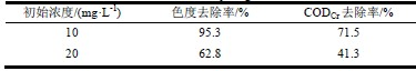 表1 不同初始濃度下臭氧混凝聯(lián)用工藝對(duì)廢水色度和CODCr 去除率的對(duì)比