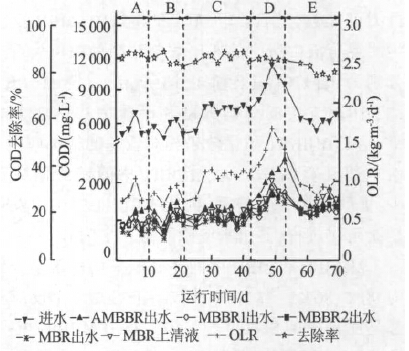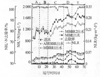 圖 5 表明,實(shí)驗(yàn)期間系統(tǒng)對(duì)COD 的總?cè)コ瘦^穩(wěn)定,在77%~89%。在A、B、C、E 運(yùn)行階段,COD 主要在缺氧MBBR 中通過(guò)反硝化作用被去除。系統(tǒng)進(jìn)水COD 為4 700~7 800 mg/L 時(shí),缺氧MBBR 實(shí)際進(jìn)水COD(考慮回流)經(jīng)計(jì)算可知約為1 500~2 500 mg/L,缺氧段出水COD 為800~1 600 mg/L,僅剩余少量可降解COD 在好氧MBBR1 中被異養(yǎng)菌消耗。而在D 運(yùn)行階段,由于該階段進(jìn)水COD 已升至約 10 000 mg/L,因此缺氧段出水中可降解COD 增多, MBBR1 對(duì)COD 的去除作用明顯增加。可見(jiàn)MBBR1 的設(shè)置減小了進(jìn)水COD 波動(dòng)對(duì)系統(tǒng)去除效果的影響。MBBR2 和MBR 對(duì)COD 去除作用不明顯,有時(shí)甚至出現(xiàn)出水COD 升高的現(xiàn)象,原因可能是其出水中含有更高濃度的亞硝氮,然而實(shí)驗(yàn)所采用的COD 測(cè)定方法無(wú)法消除亞硝氮對(duì)測(cè)定的影響。