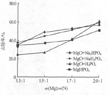采用磷酸鎂銨沉淀法處理廢水中氨氮時常用MgCl2、MgSO4 等無機鎂鹽提供鎂離子,由于這些無機鎂鹽的溶解性很好,能與水中的銨離子和磷酸根離子充分反應(yīng),具有較好的氨氮去除率。但這些沉淀劑引入了大量Cl-、SO42-,不僅難以從水中去除,還給后續(xù)生化處理造成嚴(yán)重影響。MgO 是一種生物友好型藥劑,能減少化學(xué)物質(zhì)殘留對后續(xù)生化系統(tǒng)產(chǎn)生的不良影響〔7〕。因此試驗中選擇MgO 作為藥劑。取 5 份500 mL 氨氮為1 660 mg/L 的廢水,選擇MgHPO4、MgO+Na2HPO4、MgO+NaH2PO4、MgO+H3PO4,4 組藥劑,保持m(N)∶m(P)=1∶1,分別以m(Mg)∶m(N)為1.3∶1、1.5∶1、1.7∶1、2.0∶1 進行配比,在pH=9.5 下進行沉淀試驗,結(jié)果見圖 2。