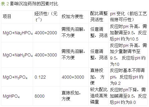綜合考慮各方面因素,選定苯胺基乙腈生產(chǎn)廢水的沉淀藥劑組合為MgO+H3PO4。