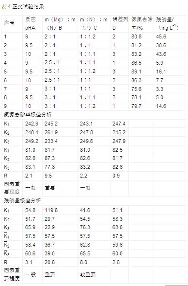 苯胺基乙腈生產(chǎn)廢水中可能含有某些油性物質(zhì),同時MgO 在水中溶解度較低,使得MAP 反應(yīng)在m(Mg)∶m(N)∶m(P)=2∶1∶1 的配比下對氨氮的去除率較低,出水氨氮仍無法滿足生化處理的要求,因此需經(jīng)正交試驗對藥劑配比進行優(yōu)化,結(jié)果見表 4。