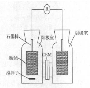 試驗(yàn)裝置采用兩室型MFC(見圖 1),陽極室和陰極室體積均為200 mL,兩室之間用Nafion 陽離子交換膜(有效面積為8.55 cm2)隔開。陽極和陰極材料均采用4 cm×4.5 cm×1 cm 的碳?xì)郑ū本┤龢I(yè)碳素有限公司),以石墨棒連接碳?xì)肿鳛殡姌O。外電阻為可調(diào)電阻箱,運(yùn)行時(shí)外電阻為1 000 Ω,使用銅導(dǎo)線連接陰陽兩極和外阻構(gòu)成MFC 外電路。數(shù)據(jù)采集系統(tǒng)為UT71D 便攜式萬用表(優(yōu)利德科技有限公司)。