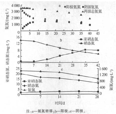 圖 4 氨氮在電池中的轉(zhuǎn)移情況及陽、陰極硝態(tài)氮和亞硝態(tài)氮的變化