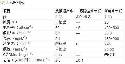 預(yù)處理產(chǎn)水進入超濾系統(tǒng)〔5〕進一步去除顆粒物和膠體物質(zhì)后經(jīng)反滲透脫鹽〔6〕直接回用至離子交換系統(tǒng)。目前該廠離子交換系統(tǒng)補水為新鮮水。將試驗產(chǎn)水與新鮮水和一級除鹽水進行水質(zhì)對比,見表 3。從表 3 看出,試驗產(chǎn)水水質(zhì)明顯優(yōu)于新鮮水水質(zhì),可滿足回用要求。