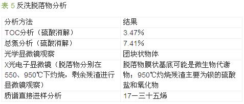 由表 4、表 5 分析結(jié)果可以看出,造成超濾膜污染的主要污染物初步判斷為有機物,因此當超濾系統(tǒng)污堵后對其進行化學(xué)清洗時需采用堿洗〔7〕。