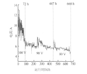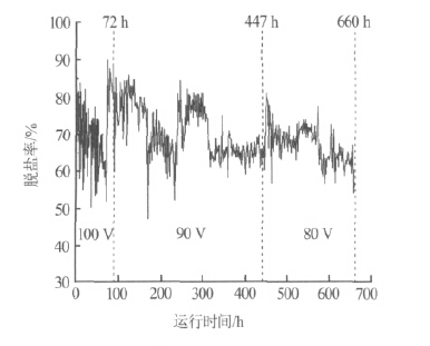 工作電壓是電滲析器在實(shí)際應(yīng)用中的一個(gè)主要參數(shù),它既關(guān)系到電滲析器的電流效率也關(guān)系到整個(gè)運(yùn)行過(guò)程的能量消耗。控制一定工作電壓運(yùn)行,可以有效避免由于電流過(guò)大所造成的電流由電極橫向通過(guò)臨近的膜傳到濃水內(nèi)流道中,產(chǎn)生熱而損壞電極附近的一些隔板和膜的現(xiàn)象〔3〕。根據(jù)現(xiàn)場(chǎng)排污水電導(dǎo)率大小及對(duì)脫鹽率的要求(約70%),控制電滲析器分別在100、90、80 V 下進(jìn)行連續(xù)運(yùn)行試驗(yàn),其中工作電壓為100 V 時(shí)運(yùn)行72 h,工作電壓為90 V 時(shí)運(yùn)行375 h,工作電壓為80 V 時(shí)運(yùn)行213 h,共計(jì)連續(xù)運(yùn)行660 h。在整個(gè)試驗(yàn)過(guò)程中,主要是考察電滲析器在同一進(jìn)水條件下,3 種工作電壓時(shí)脫鹽率、工作電流、能耗的變化。最終給出一個(gè)最佳運(yùn)行電壓、電流、脫鹽率和能耗及運(yùn)行費(fèi)用。