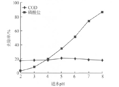 本研究廢水的pH 在4.4~5.0,綜合考慮,下面的實(shí)驗(yàn)采用不調(diào)節(jié)進(jìn)水pH,單獨(dú)考察出水pH 對(duì)COD 和磷酸鹽去除率的影響。