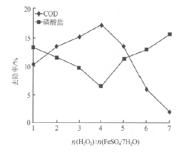 圖 2 n(H2O2)∶n(FeSO4·7H2O)對(duì)處理效果的影響