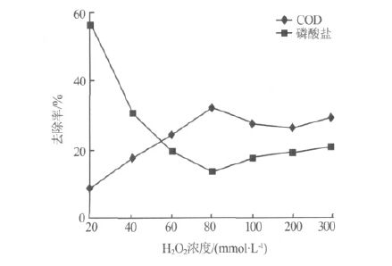 由圖 3 還可知,在H2O2 投加濃度從20 mmol/L 增加到80 mmol/L 的過(guò)程中,磷酸鹽的去除率由 56.1% 下降到13.4%,當(dāng)H2O2 投加濃度超過(guò)80 mmol/L 時(shí),磷酸鹽去除率趨于穩(wěn)定。這是因?yàn)殡S著 H2O2 投加濃度的增加,反應(yīng)體系的pH 也隨之降低,當(dāng)H2O2 投加濃度為80 mmol/L 時(shí),反應(yīng)體系的pH 由4.4 下降到2.8,此后隨著H2O2 投加濃度的增加,反應(yīng)體系的pH 基本不再變化,此時(shí)磷酸鹽的去除率也趨于穩(wěn)定。