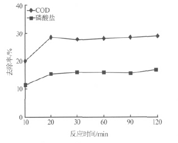 由圖 4 可知,F(xiàn)enton 試劑初始反應(yīng)速度很快,反應(yīng)開(kāi)始10 min 時(shí)COD 去除率即達(dá)到了20.5%,此后 COD 去除率隨時(shí)間變化逐漸變緩,當(dāng)反應(yīng)時(shí)間超過(guò) 20 min 以后,COD、磷酸鹽的去除率分別穩(wěn)定在 29.0%、15.4%左右,說(shuō)明此時(shí)反應(yīng)已趨于完全。因此實(shí)驗(yàn)中確定最佳反應(yīng)時(shí)間為20 min。