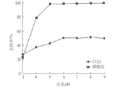 磷酸鹽的去除率隨出水pH 的升高而迅速增加,當(dāng)出水pH 由2 升高到3 時(shí),磷酸鹽的去除率由 23.0%迅速增加到78.8%,當(dāng)出水pH=5時(shí),磷酸鹽的去除率已達(dá)到98.0%,廢水中的磷酸鹽基本去除。這是因?yàn)樵趬A性條件下,F(xiàn)e3+與磷酸根形成難溶性的FePO4 沉淀,同時(shí)Fe3+逐漸水解生成聚合度大的 Fe(OH)3 膠體絮凝劑,通過(guò)電中和、吸附架橋及卷掃作用使膠體凝聚將COD 和磷酸根去除〔12〕。綜合考慮,確定調(diào)節(jié)出水pH=6。