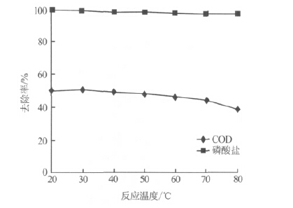 由圖 6 可知,在反應(yīng)溫度為20 ℃時(shí),COD、磷酸鹽的去除率分別為50.3%、98.6%,已達(dá)到理想效果,隨著溫度的升高,COD 的去除率緩慢下降,隨著溫度升高到80 ℃時(shí),COD 的去除率降為39.7%,磷酸鹽的去除率則一直保持在96.0%以上。