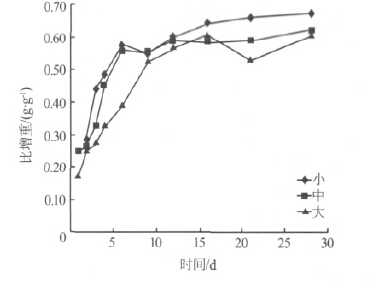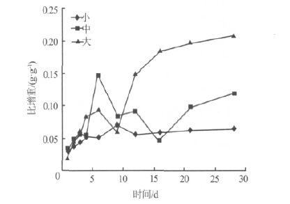 由圖 2 可知,對于2# 填料,其中的小尺度填料比增重最高、中尺度次之、大尺度最低,增重規(guī)律與 1# 填料恰恰相反。中尺度填料在前期增重情況優(yōu)于大尺度填料,后期二者較為接近。16 d 左右大、中尺度填料曲線趨于穩(wěn)定,說明掛膜基本結(jié)束;小尺度填料則始終處于增重狀態(tài)。從比增重數(shù)值來看,2# 填料比增重(0.3~0.8 g/g) 情況明顯優(yōu)于1# 填料(0.02~ 0.16 g/g)。